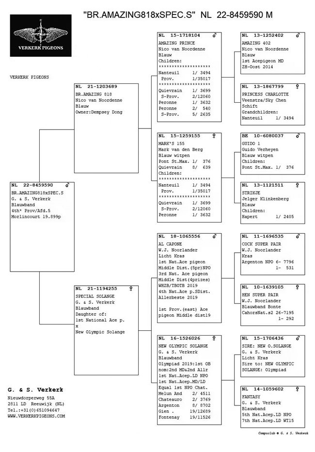 4. NL2022-8459590 | 2022年 默林克尔300公里 | 19899羽 NPO幼鸽赛4名 > 父亲:NL21-1203689 | “神奇818”兄弟——青岛董先生所有,父亲“神奇王子”来自尼可·范诺登原舍,后代获得南图3494羽冠军、35017羽 全省总冠军、魁夫兰3699羽冠军、佩罗讷3632羽冠军等母亲,母亲“马克155”来自马克·范登伯格。