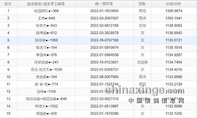 本关季军则是来自会员张志杰的一羽爱将,足环号0612150,分速1138米/分。
