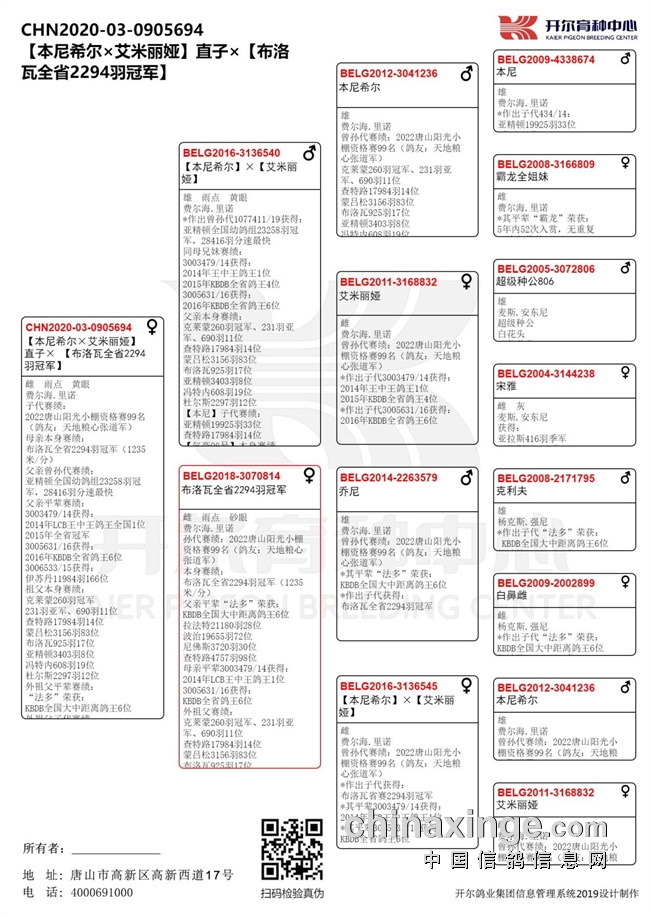 99名环号22-12-0182786,父亲同样是从开尔引进,出自费尔海.里诺血统,是【本尼希尔】×【艾米丽娅】与布洛瓦全省2294羽冠军共同作育。