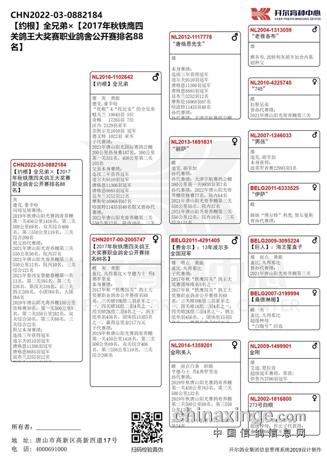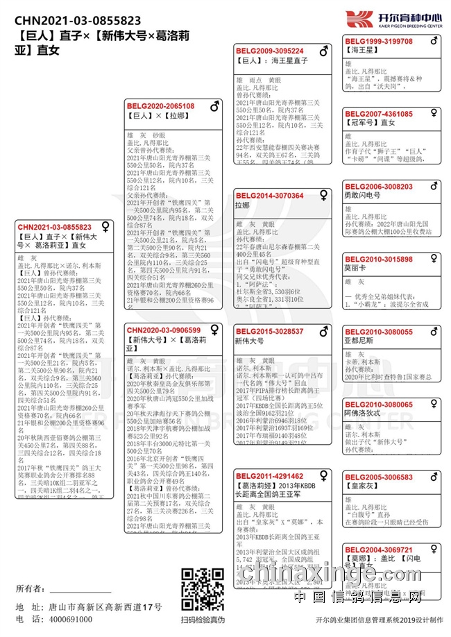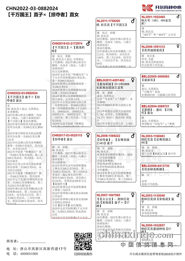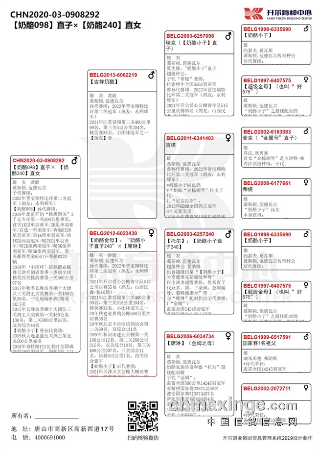 冠军鸽父亲出自开尔葛斯顿·范德瓦尔奶酪血系,出自奶酪小子直子瑞克子代【吉祥奶酪】与奶酪小子直子托尔子代【奶酪金母】近亲作育!