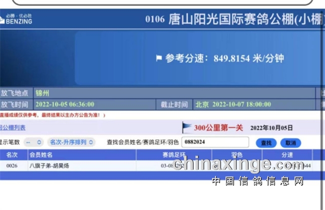 同日鸽友八旗子弟胡昊炀从开尔购买的幼鸽03-0882024直接参加唐山阳光小棚比赛获得26名。