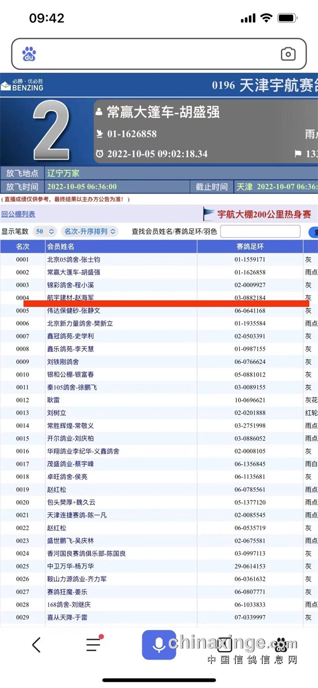 还有一位非常幸运的鸽友航宇建材-赵海军,曾在开尔购买幼鸽,获赠一羽环号为22-03-0882184幼鸽,送往天津宇航赛鸽公棚,获得宇航200公里热身赛第4名,随后又在400公里预赛中获得17名的好成绩!