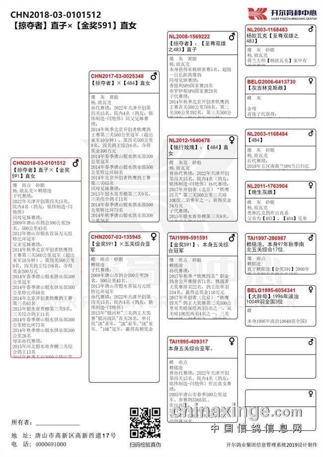 获奖鸽父亲同样是出自开尔杨·欧瓦克经典配对【千万国王X超速时分】的后代,它的母亲是【千万国王X超速时分】的女儿杨欧瓦克【千万号】,父亲是出自盖比【闪电号】家族,【百发百中】与盖比【闪电号】直子× 2010年亚精顿全国冠军【宝拉】共同作育的17年北京开创铁鹰四关综合19名【百丽闪电】。融合了盖比与杨欧瓦克两大铭血,又是出自经典配对,一定是能飞出高位赛绩的。