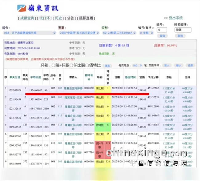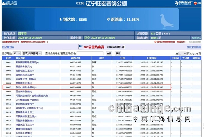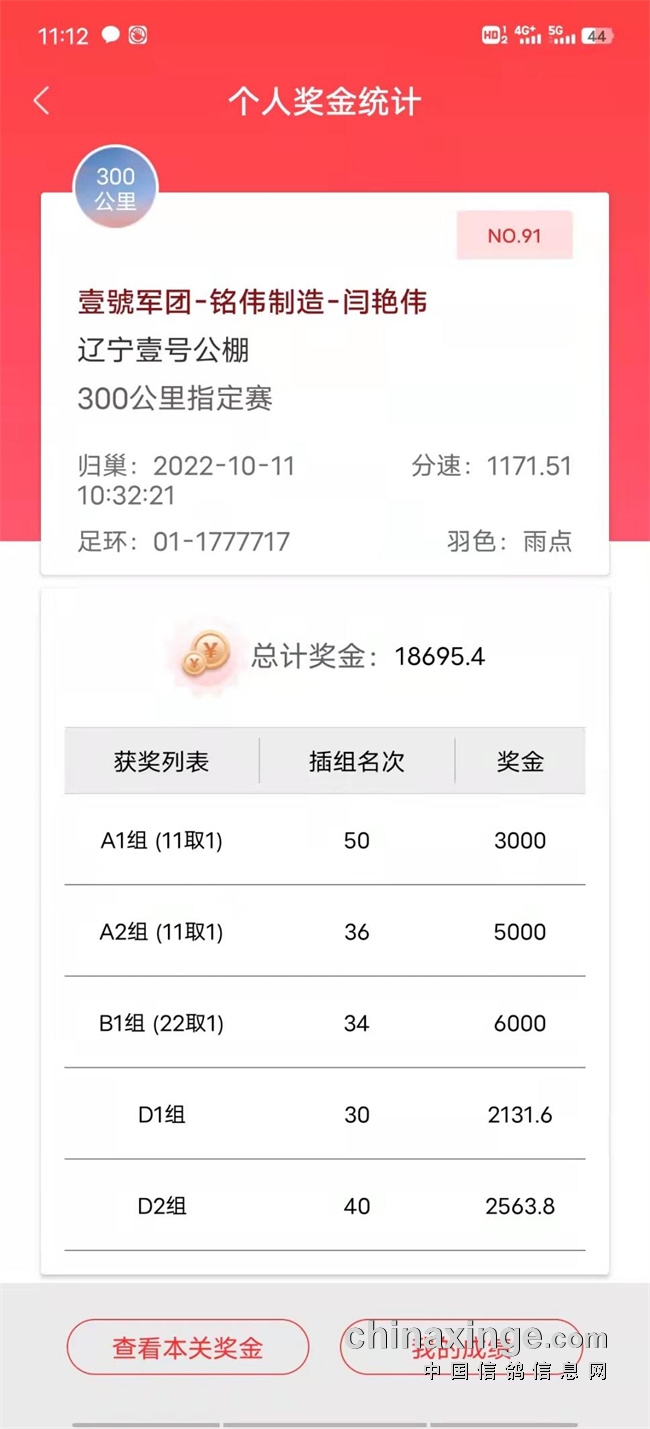 随后这位鸽友又传来好消息,获得2022年辽宁壹号公棚300公里指定赛91名。