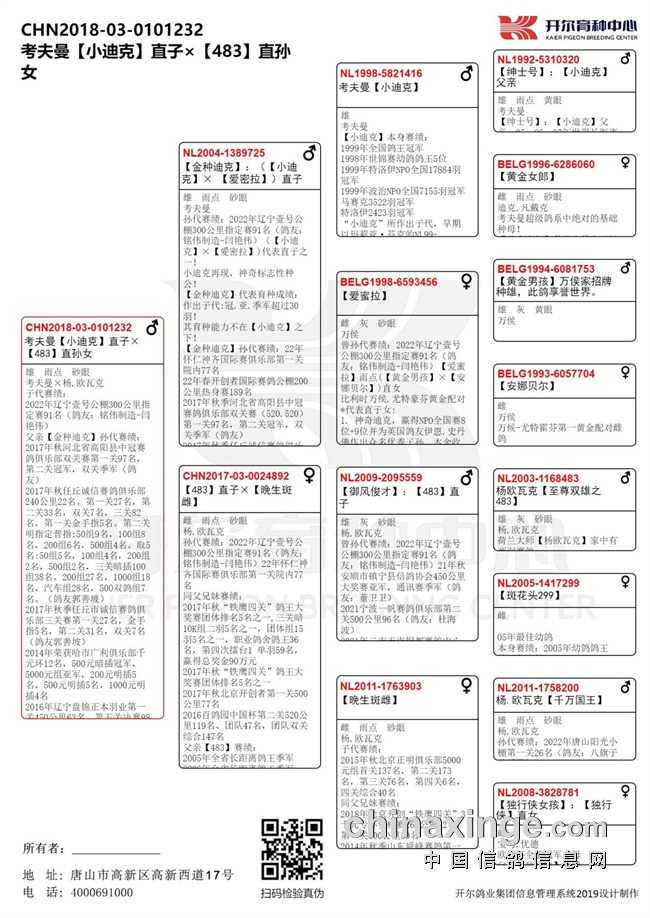 这羽赛鸽的父亲同样出自开尔杨欧瓦克血系,父亲是【小迪克】与【爱密拉】的直子【金种迪克】,母亲是【483】直子:【御风俊才】×【晚生斑雌】。