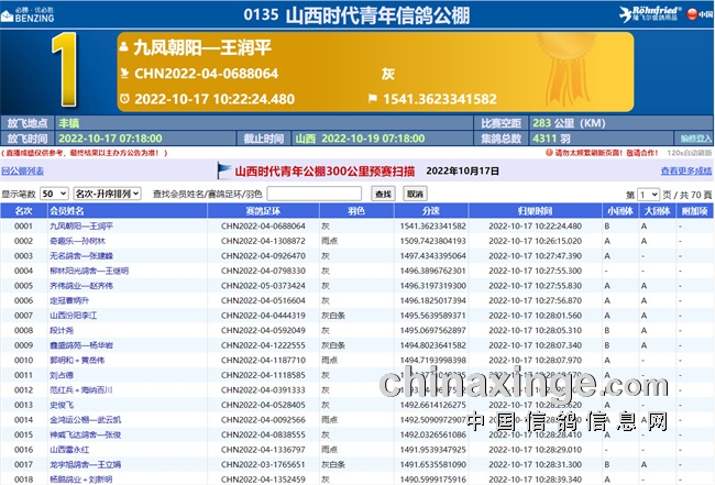 10月17日晚8点,又有冠军鸽主九凤朝阳-王润平获得山西时代青年信鸽公棚300公里预赛4311羽冠军