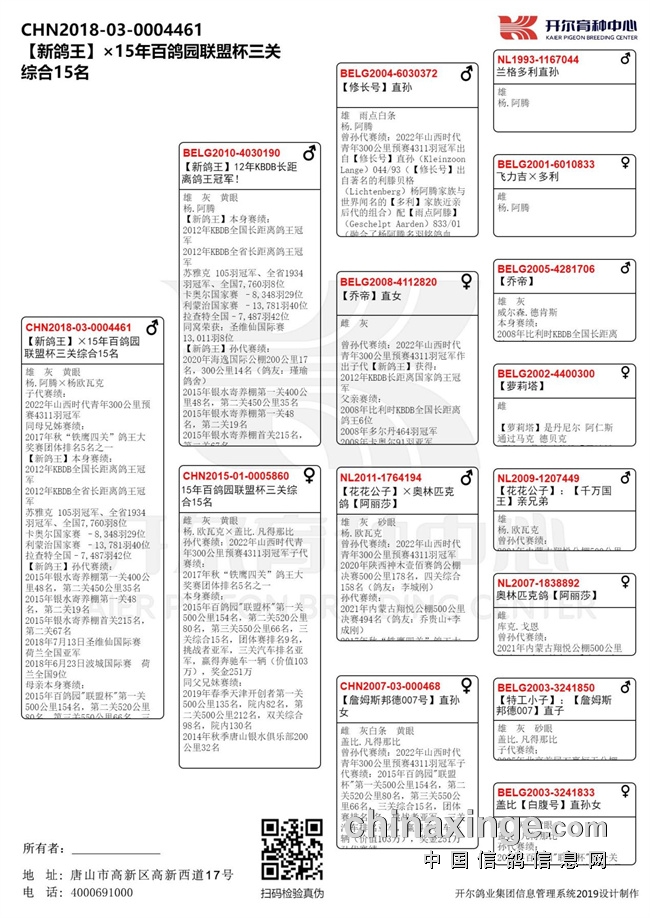 它的父亲是杨·阿腾的是12年KBDB长距离鸽王冠军【新鸽王】,母亲是杨·欧瓦克15年百鸽园联盟杯三关综合15名,两大铭血傍身,两羽顶级赛将共同作育让0004461身负光环,其子代很难默默无闻!