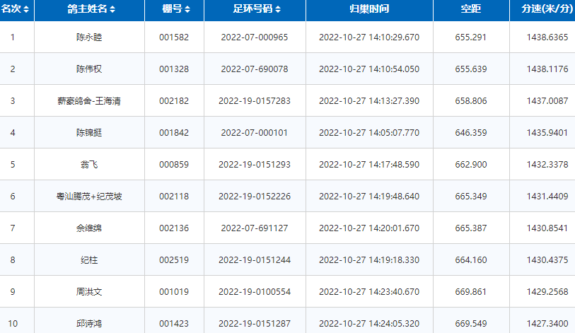 果然,五分钟过后,陈永睦的2022-07-000965赛鸽第二个报到,飞行空距655.291公里,以1438.6365米/分的全场最高分速获得冠军。陈伟权的2022-07-690078赛鸽飞行655.639公里,分速为1438.1176米/分,获得比赛亚军。薪豪鸽舍-王海清的2022-19-0157283赛鸽于14:13归来,获得比赛季军。