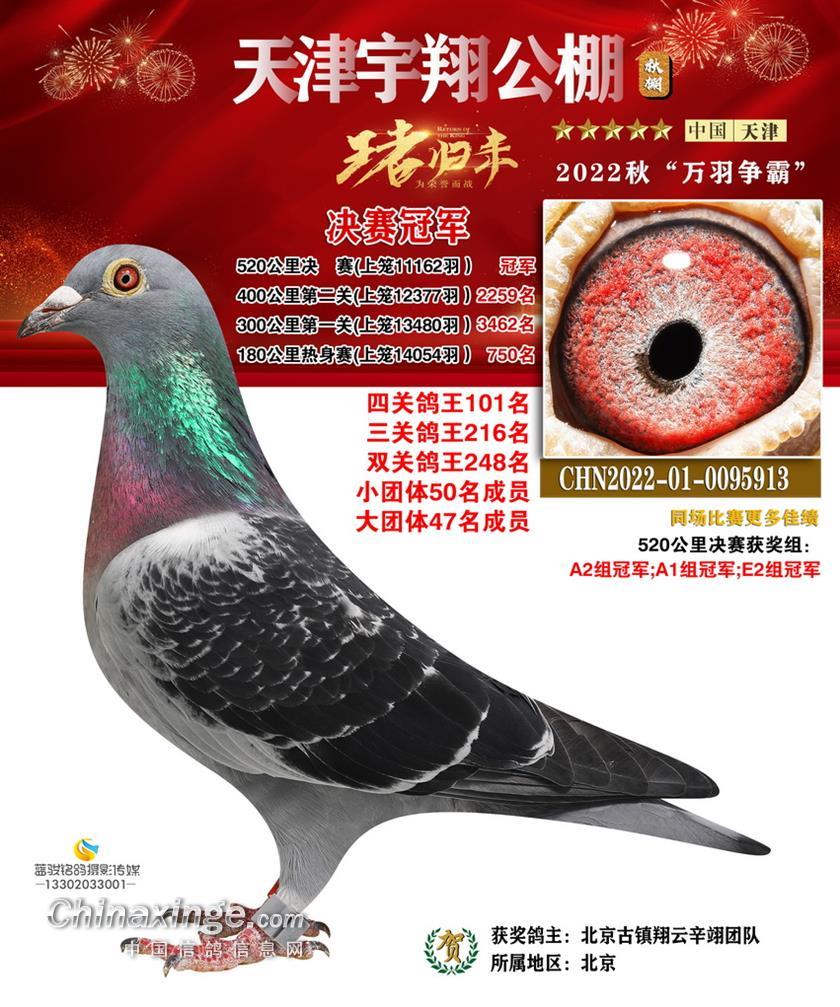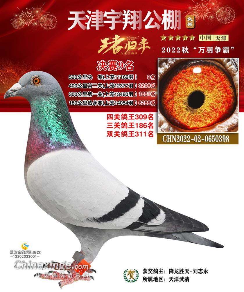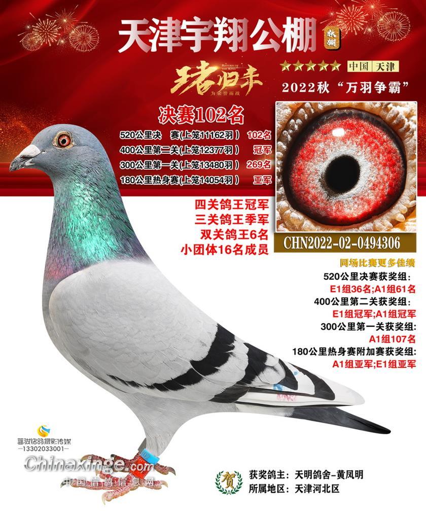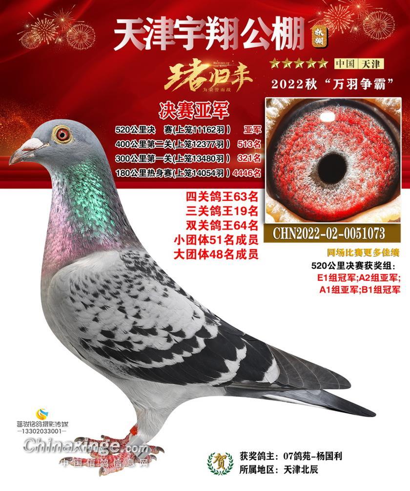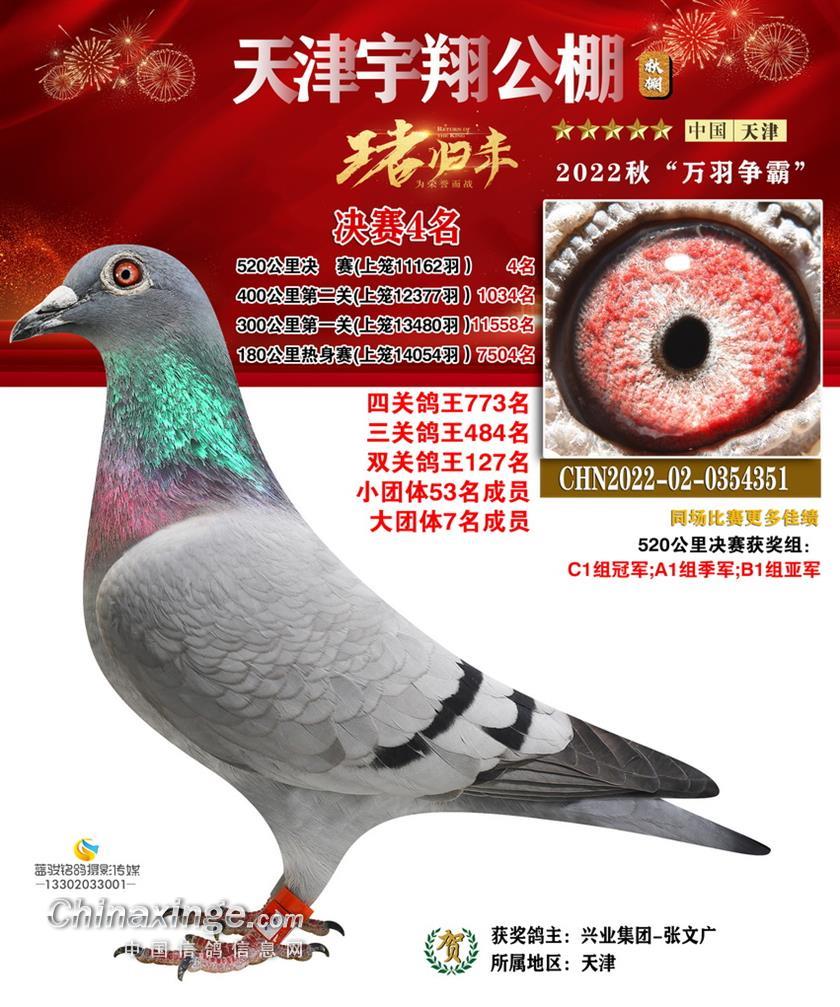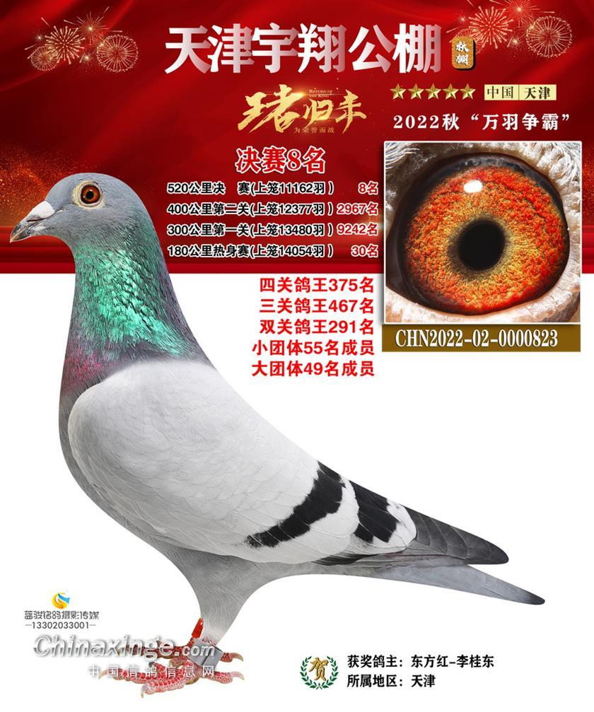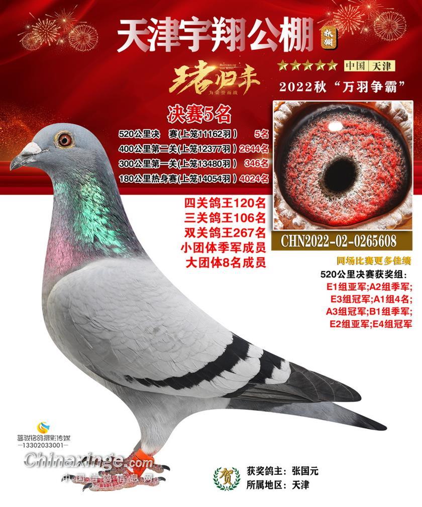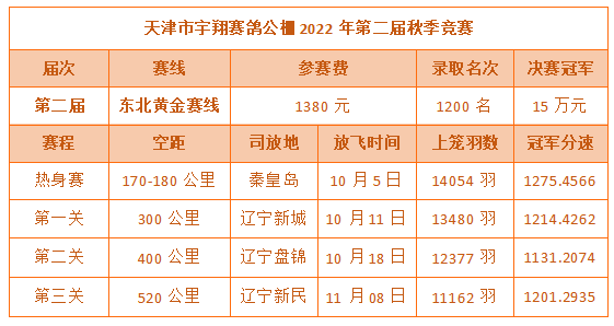 10月5日举行170-180公里热身赛便迎来开门红,放飞14054羽,归巢13000多羽,归巢率96%,冠军是八九鸽业-韩仲久的2022020515774赛鸽,分速为1275.4566米/分。一周后,10月11日,天津宇翔迎来300公里首关正赛,13480羽将士得到战令,迎风出发,12000多羽小将经受住考验,顺利归来,归巢率91%;辽宁北镇嘉鑫犬鸽-李宝玉2022010980042的爱将,以1214.42米/分的成绩斩获冠军,首关取得大捷。10月18日,12377羽继续迎战400公里第二关,经历6个多小时的艰难飞行,第一梯队赛鸽抱团归来,天明鸽舍-黄凤明2022020494306的灰白条摘得桂冠,分速1131.2074米/分,在有效时间内,共计归巢11000多羽,归巢率90%。10月24日,天津宇翔进入最终决战,11162羽小战士蓄势待发,带着必胜的决心,争夺最后的荣耀;北京古镇翔云辛翊团队的雨点鸽王者归来,环号2022010095913,以1201.2935米/分的成绩夺得冠军;07鸽苑-杨国利2022020051073的赛鸽拿下亚军,分速1199.1166米/分;季军是北京通州赵义2022010381565的爱将,分速1196.7223米/分,本场比赛最终以8000多羽的有效归巢圆满结束。