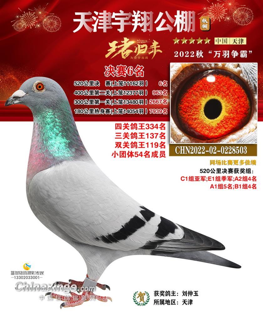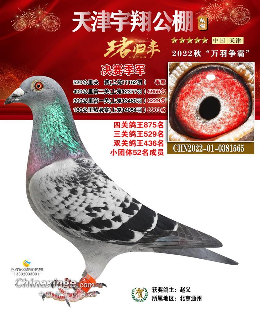 从八月的夏日炎炎,到十月的秋韵渐浓,经历十一次训放,一关热身赛、三关正赛的考验,天津市宇翔赛鸽公棚第二届秋季大奖赛,在十月末落下帷幕。在今年的秋赛中,天津宇翔一次次创造赛场纪录,三次上笼万羽,归巢万羽,打到决赛还存棚万羽,可谓战绩卓绝。各位参赛的小战将们也不负众望,纷纷展示自己的风采:北京古镇翔云辛翊团队2022010095913的雨点鸽王者归来,以1201.2935米/分的成绩斩获决赛冠军;07鸽苑-杨国利2022020051073的赛鸽拿下决赛亚军,分速1199.1166米/分;决赛季军是北京通州赵义2022010381565的爱将,分速1196.7223米/分。四关鸽王桂冠被天明鸽舍-黄凤明2022020494306灰白条夺得,四场成绩为:180公里热身赛亚军、300公里一关269名、400公里二关冠军、520公里决赛102名。