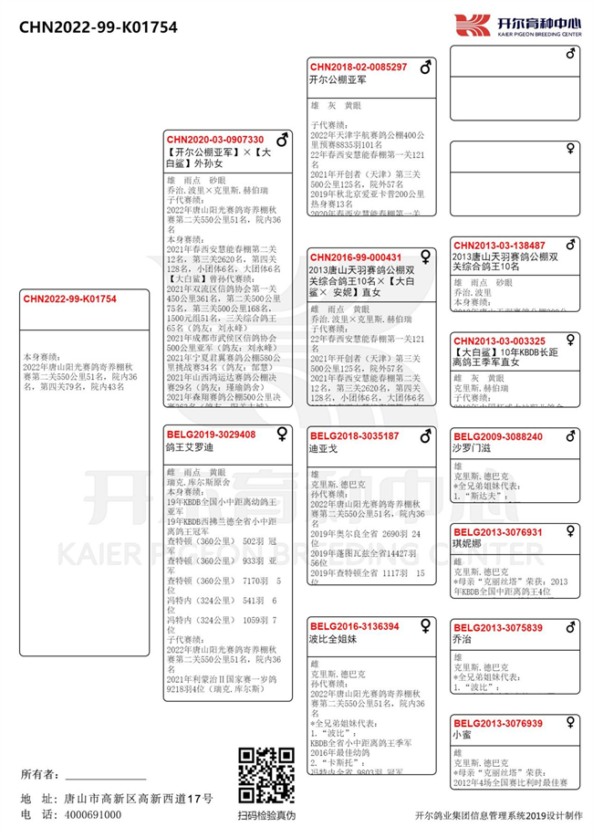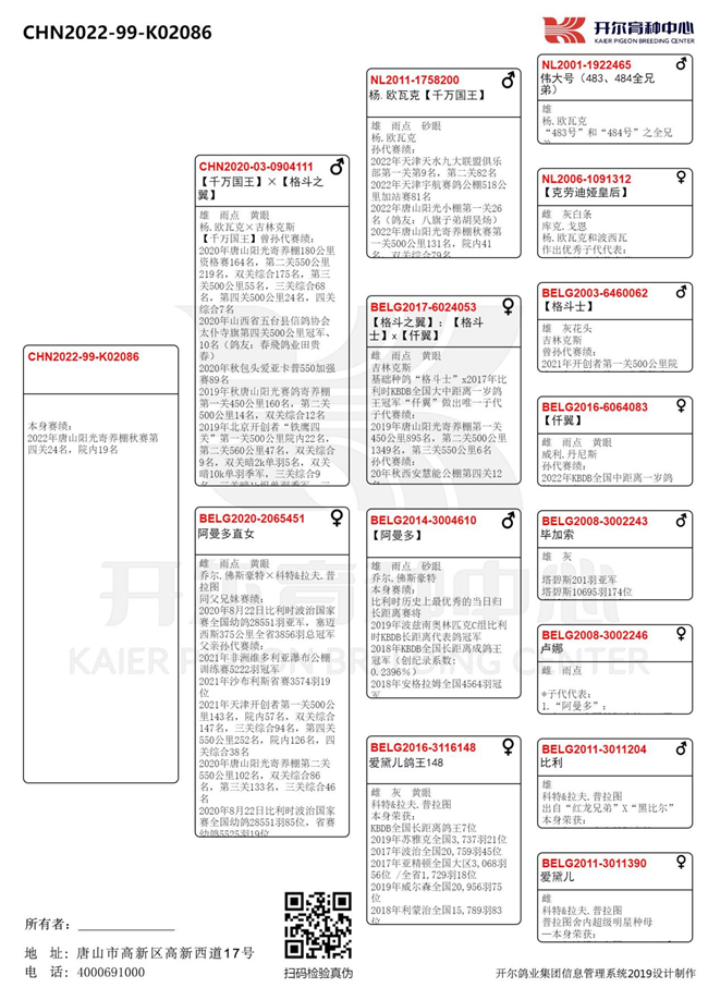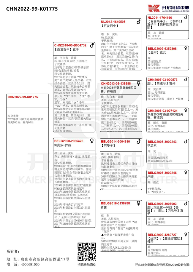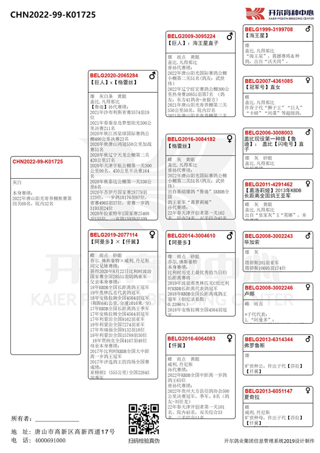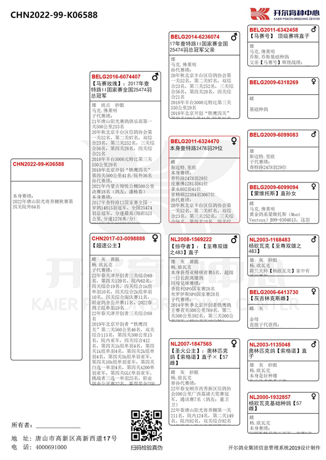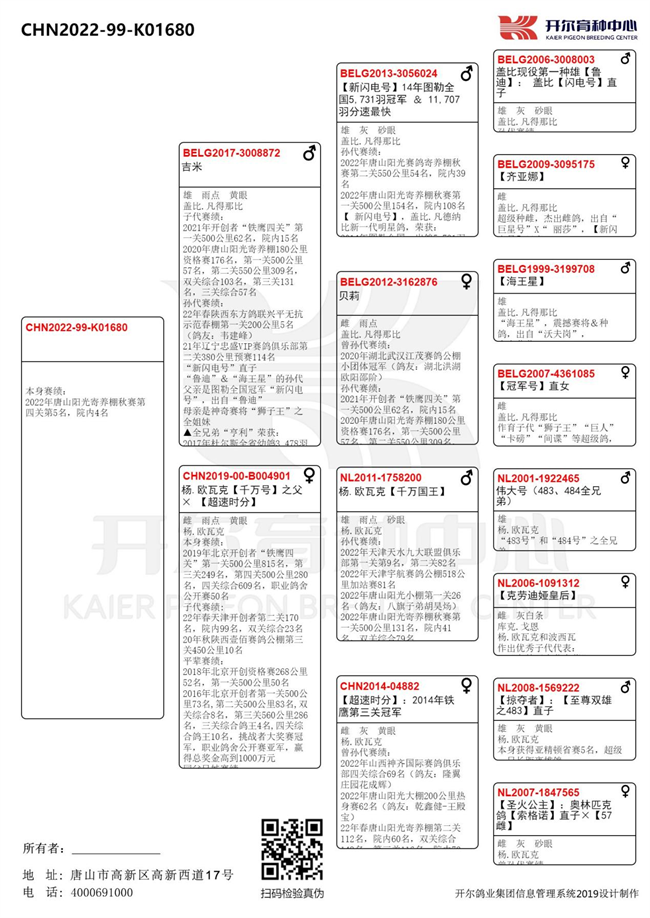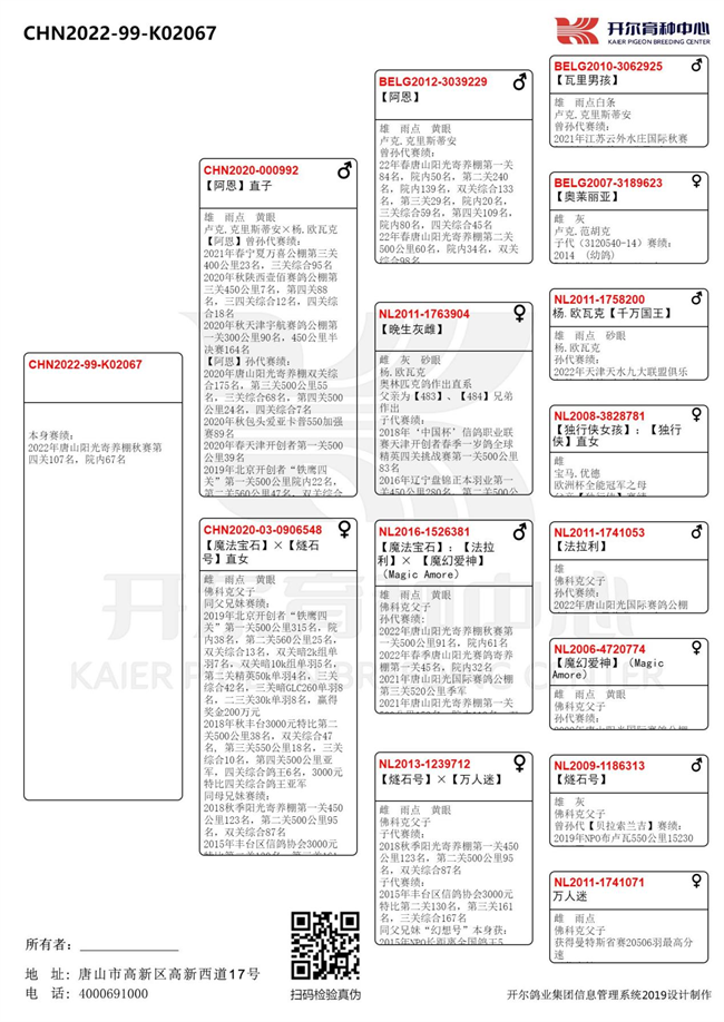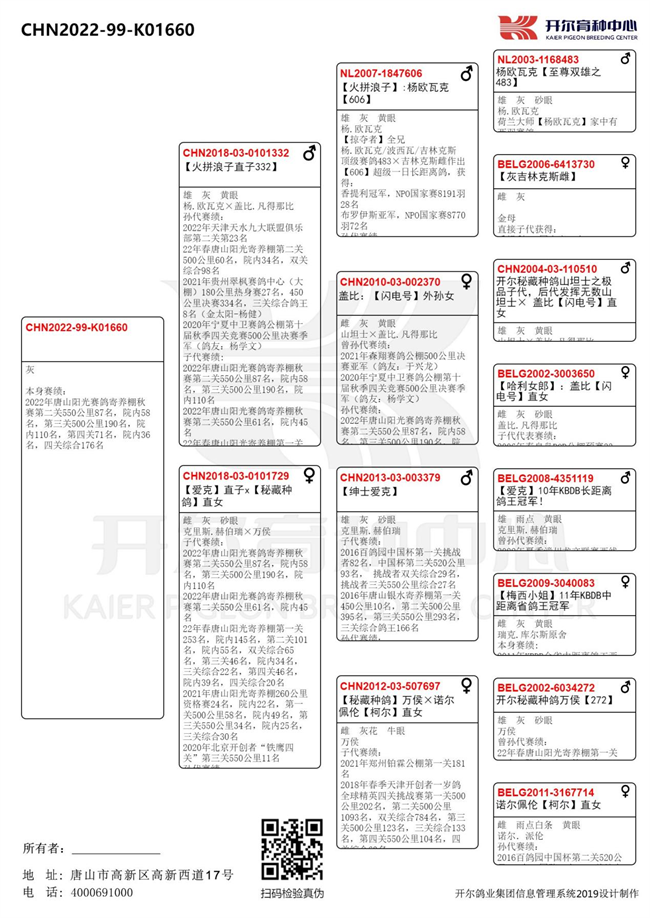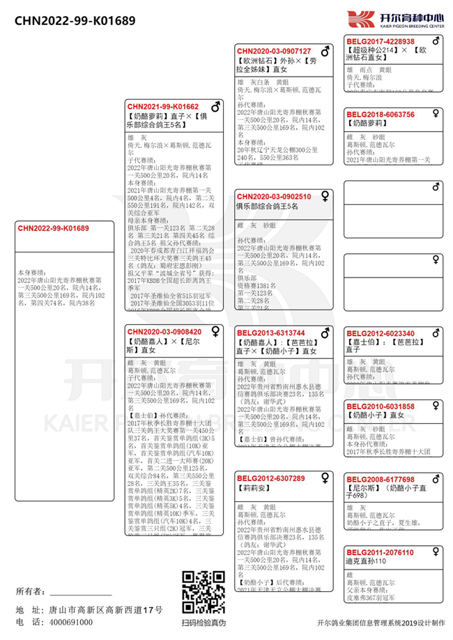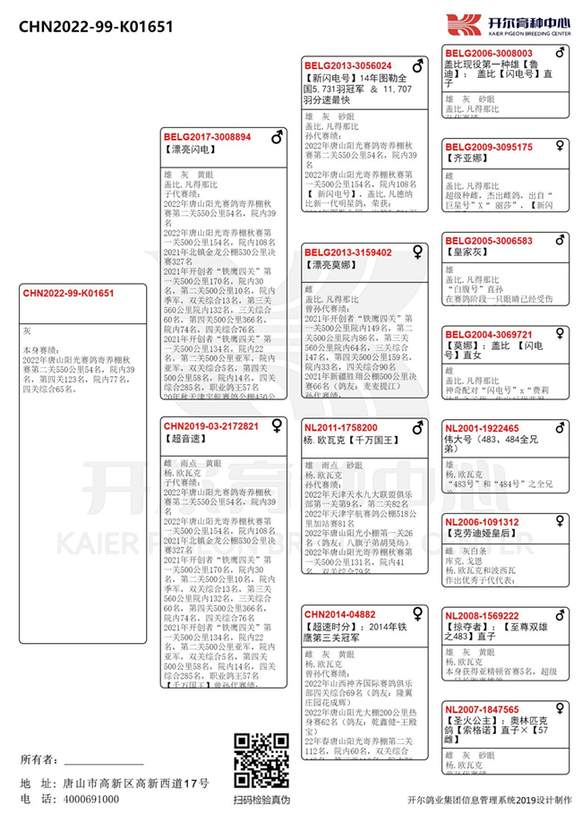 出自倚天·梅尔浪与葛斯顿·范德瓦尔血系,奶酪家族,父亲是【奶酪萝莉】直子与【俱乐部综合鸽王5名】作育,曾获得2021年唐山阳光寄养棚第一关500公里4名,院内4名,第二关550公里191名,院内142名,双关综合亚军!