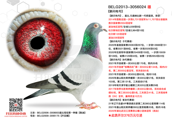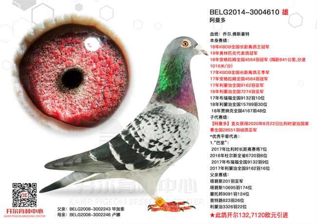 母亲是10年KBDB长距离鸽王冠军【爱克】的孙代,是【爱克】与11年KBDB中距离省鸽王冠军【梅西小姐】所出直子【绅士爱克】和开尔秘藏种鸽万侯【272】直女共同作育!