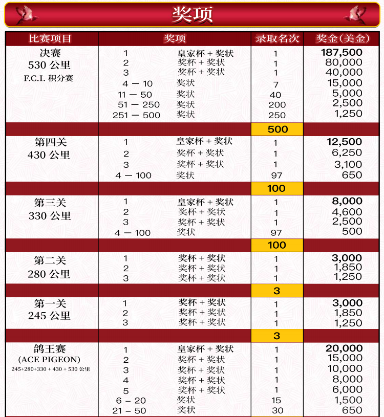 今年举办第七届比赛,泰国芭提雅公棚总奖金178万美金,总冠军奖励187500美金,五关鸽王奖励20000美金,总计50个国家和地区、9462羽赛鸽报名参赛,其中中国鸽友与欧洲鸽友组团参赛,有409羽参赛鸽。