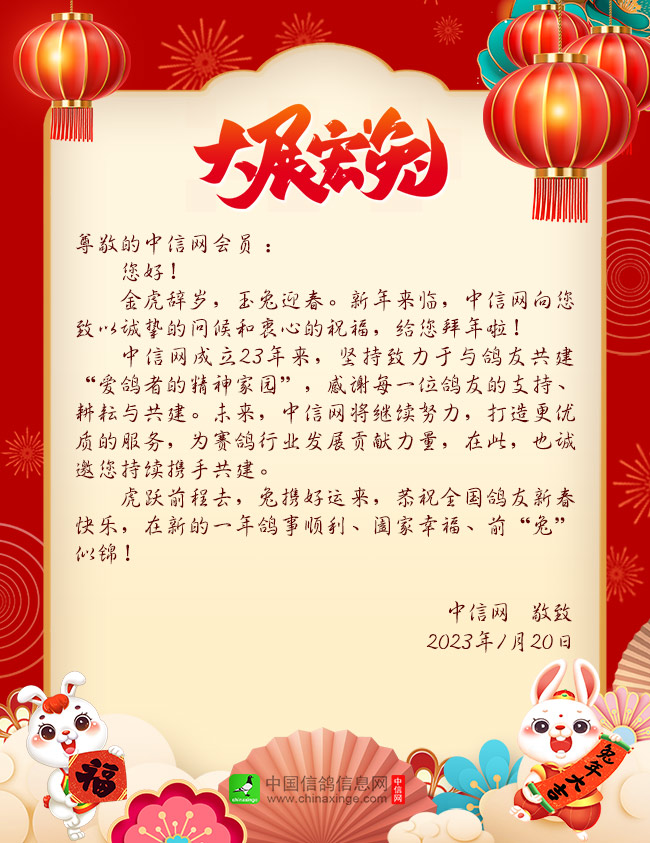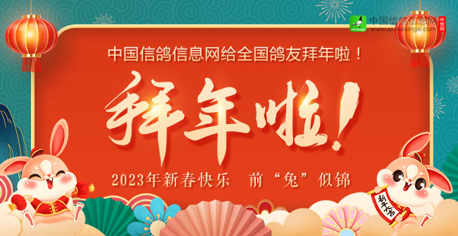 金虎辞旧岁,玉兔迎新春,新年来临,中国信鸽信息网给您拜年啦!恭祝全国鸽友新春快乐,在新的一年鸽事顺利、阖家幸福、前“兔”似锦!