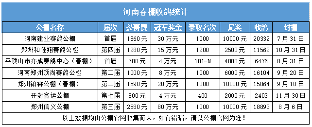 在中信网入驻的河南春棚有11家,其中7家进行春赛并顺利地完成了收鸽工作。由于多方面因素影响,整体来看河南春棚的收鸽工作进行得相对较慢,往年的封棚时间普遍在六七月份,今年则是足足延后了一两个月有余,最晚的开封鑫运公棚更是在11月30日才正式封棚。下面是对河南春棚收鸽状况的统计数据及具体分析:
