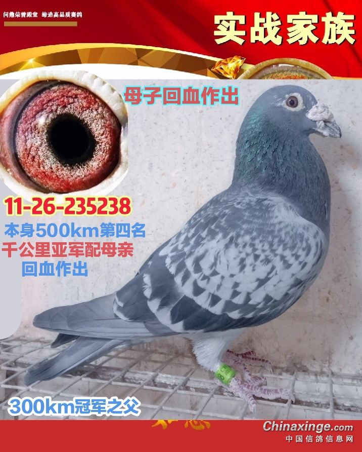 第七组配对是母子回血雄238配超霸109,前天下午产下了首枚蛋。雨点砂眼雄238是一羽2011年鸽子,今年算起来差不多也11岁多了,是由千公里亚军配其母亲回血作出。