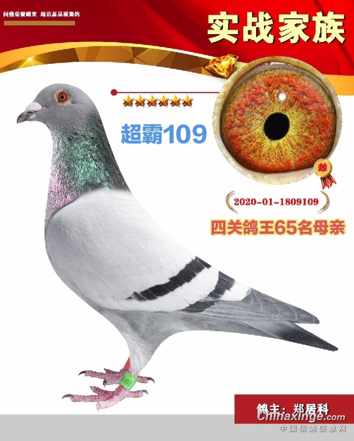 配对雌超霸109是一羽2020年瓦灰黄眼鸽,曾配白爪雄作出过四关鸽王等成绩鸽,也配盖比957瓦灰砂眼雄作出过地方赛小奖鸽。