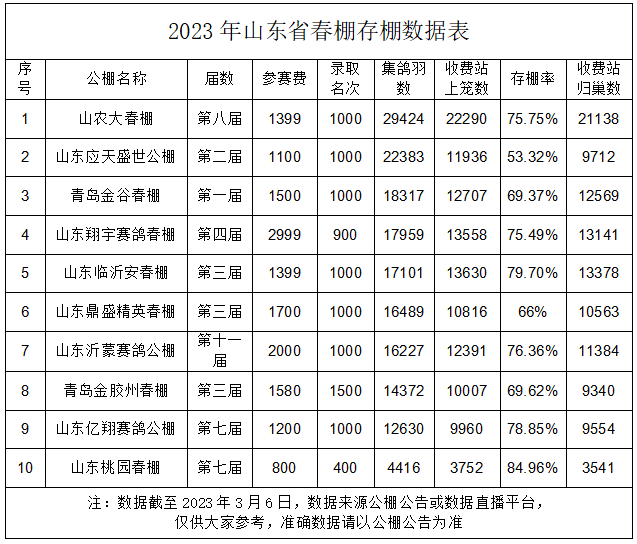 但从存棚率上看,并非收鸽越多存棚率就越高,10家公棚平均存棚率72%,最高的是山东桃园春棚,今年收鸽虽然只有4416羽,但精管细养,收费站上笼3752羽,存棚率达84.96%,最终收费站归巢3541羽。桃园春棚3月5日打响第一关热身赛,扫描上笼3331羽,至次日归巢2900多羽。