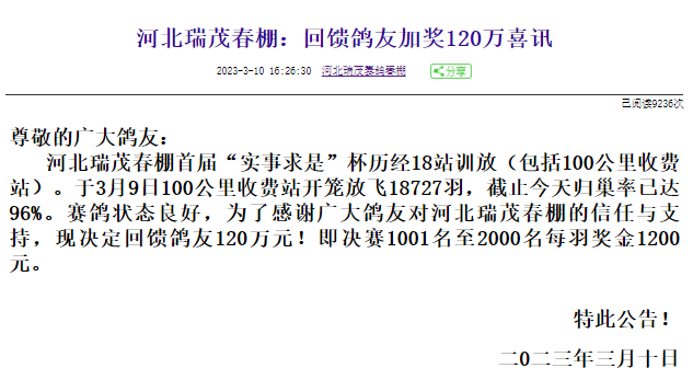 为了感谢广大鸽友的支持与信任,瑞茂公棚于3月10日发布公告,决定回馈鸽友120万元!即决赛1001名至2000名每羽奖金1200元。根据此前发布的比赛规程,瑞茂公棚本届比赛参赛费是1180元/羽,决赛奖1000名,决赛奖金分别为冠军12万元、亚军6万元、季军3万元、4-10名15000元、11-1000名8000元。