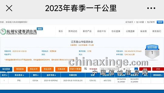 江苏千公里联赛于5月18日早晨5:58在陕西省咸阳市乾县开笼,全省15067羽放飞,苏州市共集鸽523羽,其中昆山市127羽。