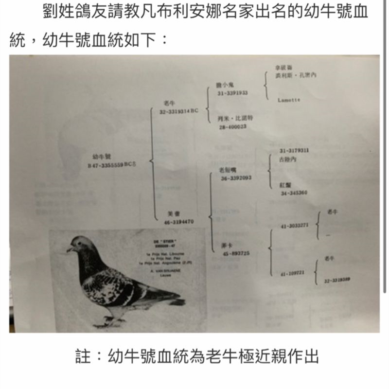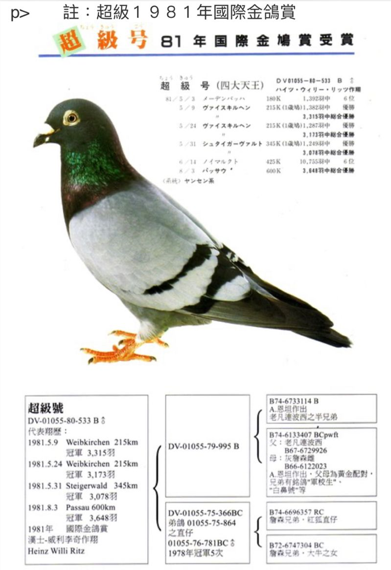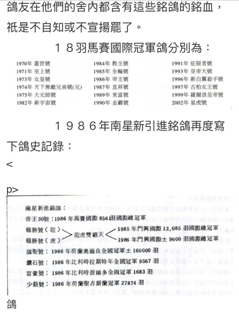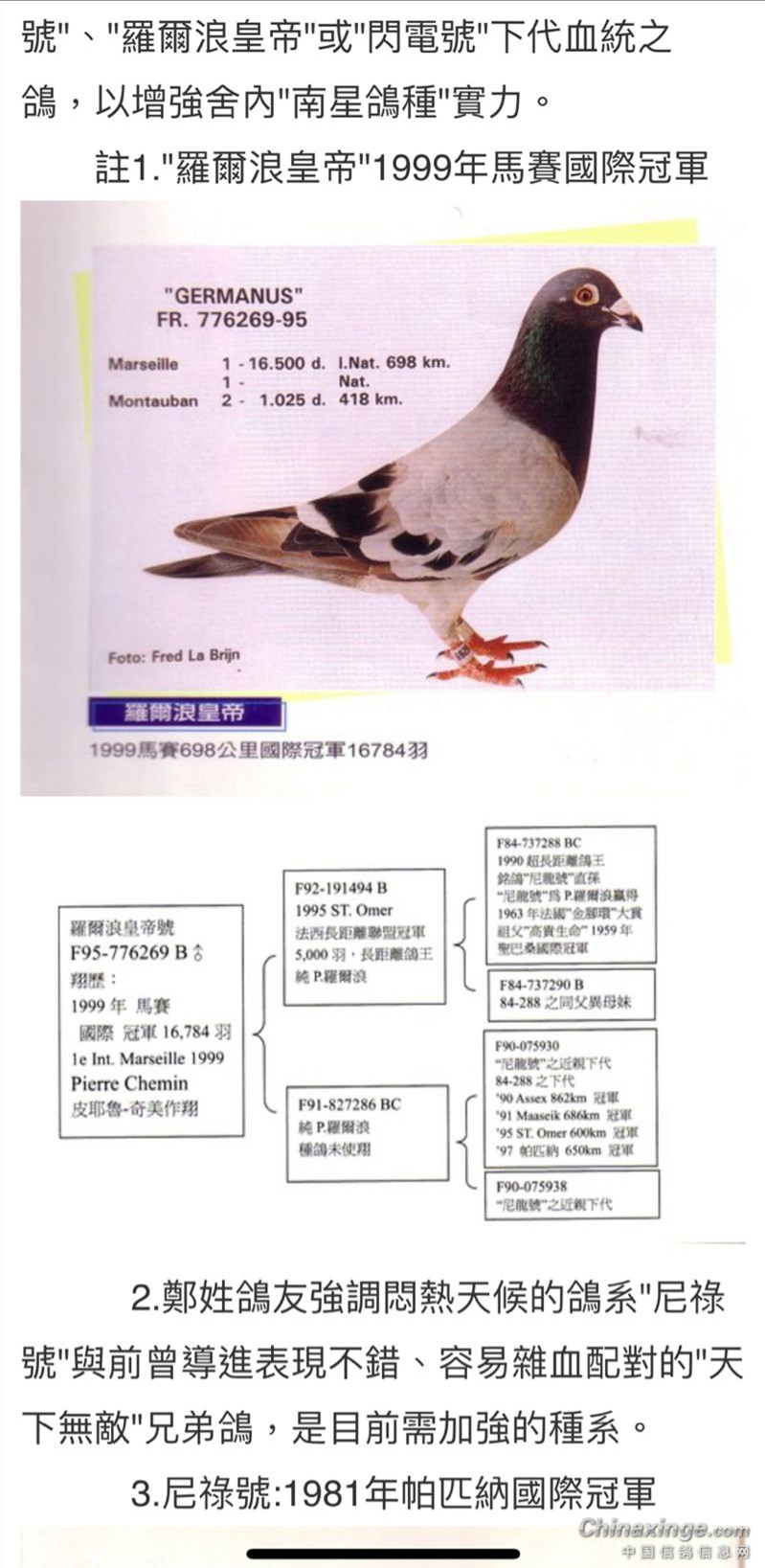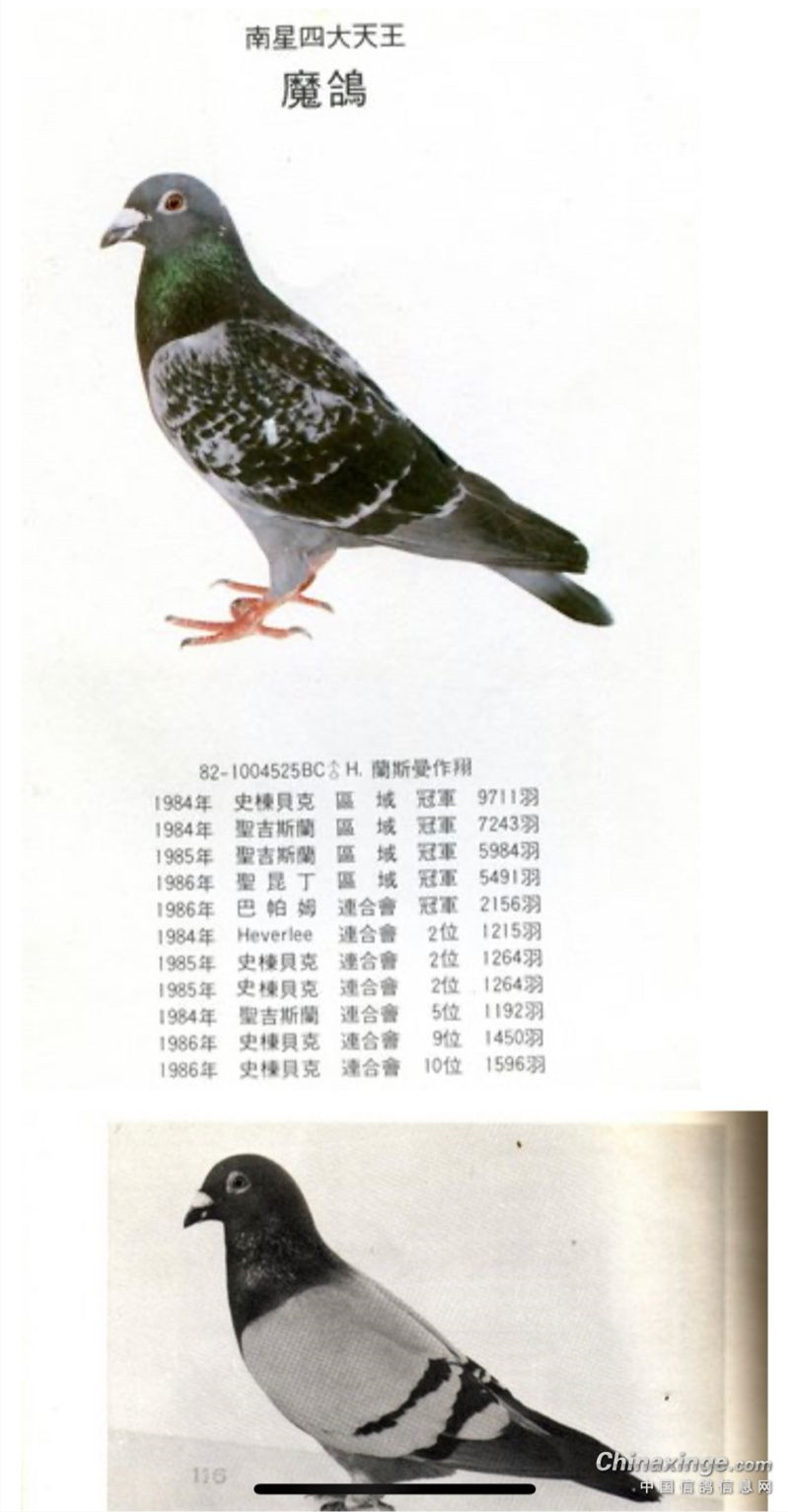 铭鸽之所以称之为铭鸽,不仅是自身成绩斐然,更需要后代表现优秀,成为更多人信赖与热衷引进的血系。铭血永流传,代代是旺代,1981年波品纳国际冠军“尼禄号”与“南星鸽种”便是这样的铭鸽。
