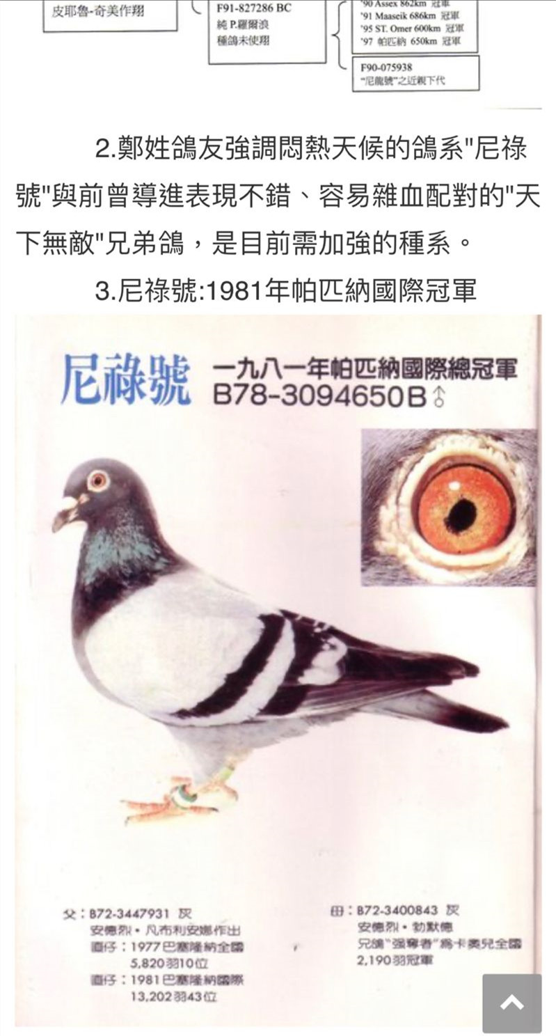 一位郑姓鸽友曾说:闷热天候的鸽系“尼禄号”与前曾导进表现不错、容易杂血配对的“天下无敌兄弟”鸽,是目前需加强的种系。