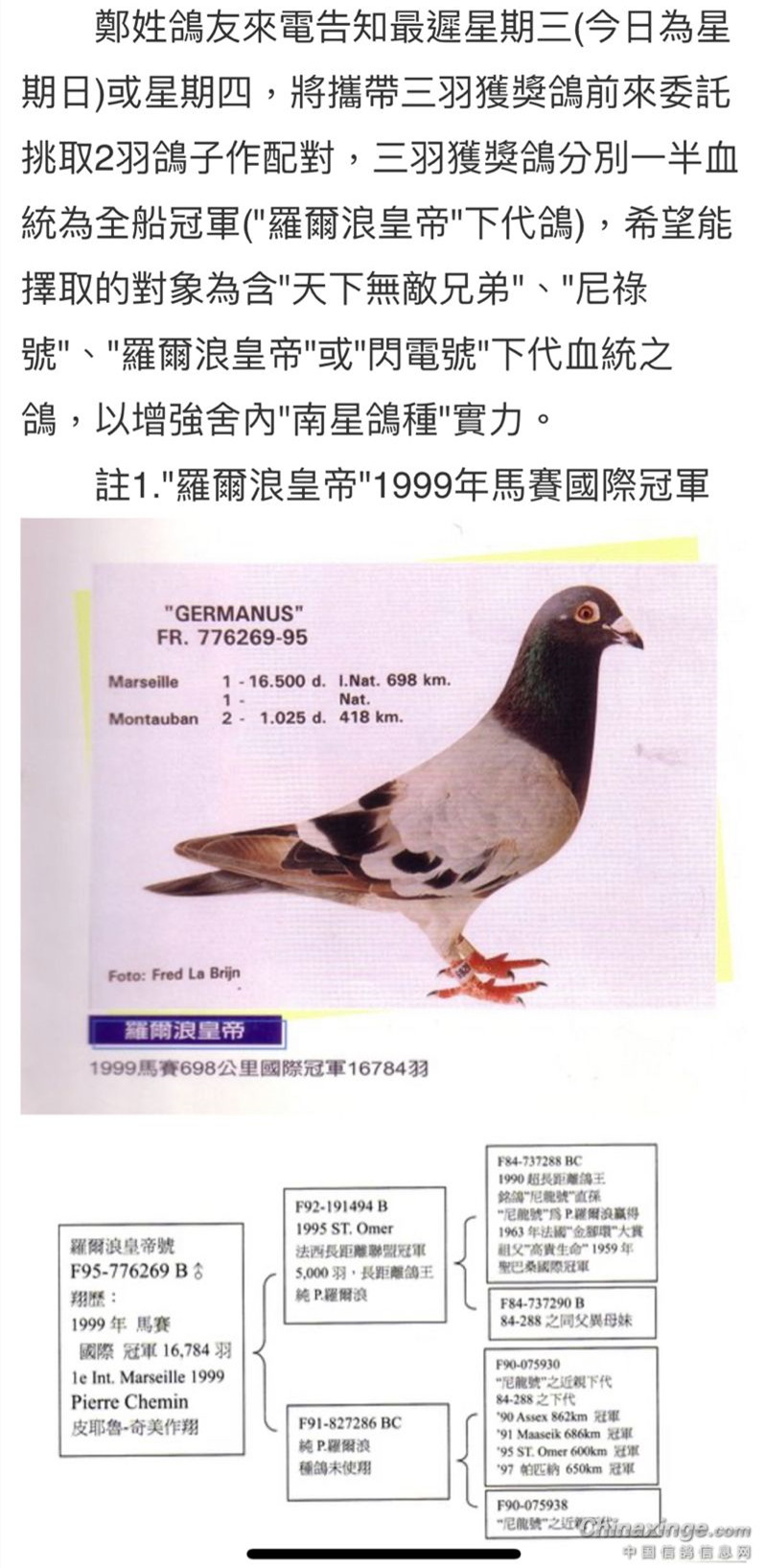 郑姓鸽友在用三羽获奖鸽来挑取另外两羽鸽子作配对时,三羽获奖鸽一半血统为全船冠军(“罗尔浪皇帝”下代),希望能择取的对象为含“天下无敌兄弟”、“尼禄号””罗雨浪皇帝“或”闪电号“下代血统之鸽,以增强舍内“南星鸽种”实力。