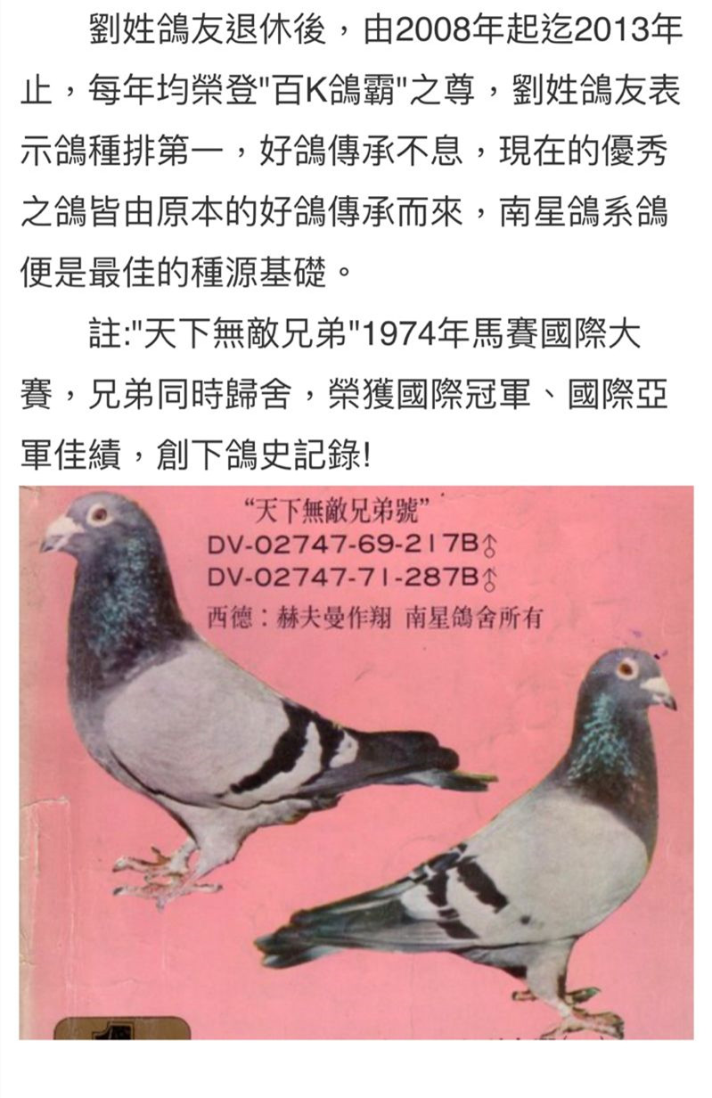 另一位刘姓鸽友退休后,由2008年起到2013年止,每年均荣登“百K鸽霸”之尊,刘姓鸽友表示鸽种排第一,好鸽传承不息,现在的优秀之鸽皆由原本的好鸽传承而来,南星鸽系鸽便是最佳的种源基础。