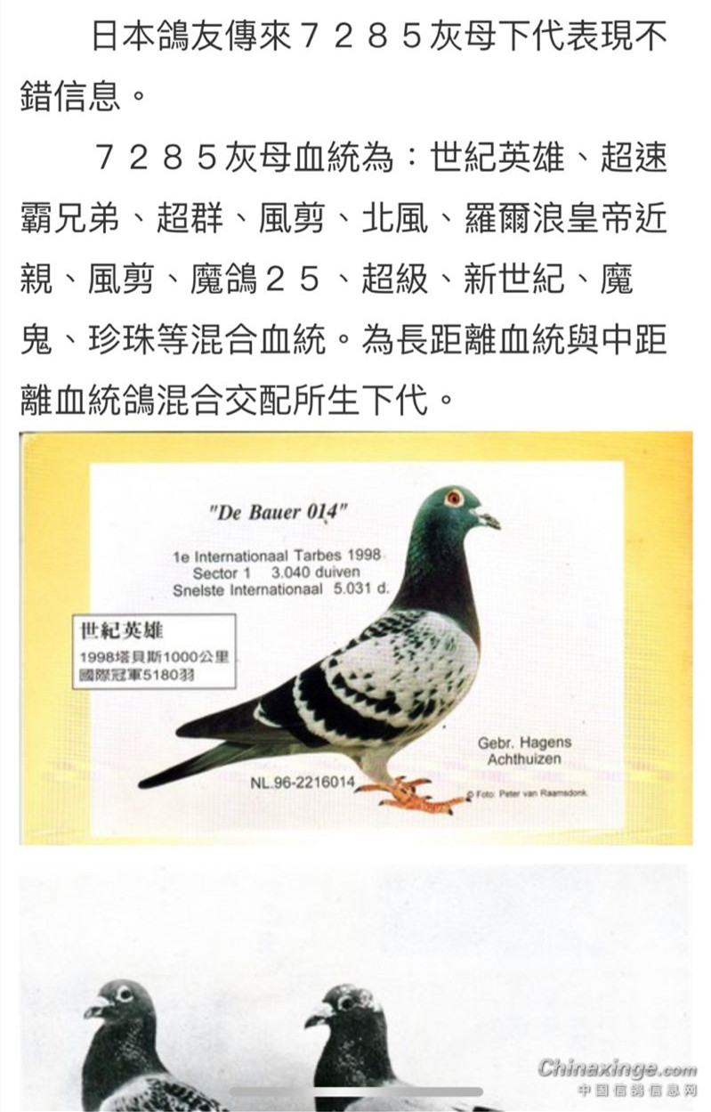 而日本鸽友也传来7285灰母下代表现不错的信息。这羽灰母血统为:世纪英雄、超速霸兄弟、超群、风剪、北风、罗尔浪皇帝近亲、风剪、魔鸽25、超级、新世纪、魔鬼、珍珠等混合血统。为长距离血统与中距离血统鸽混合交配所生下代。