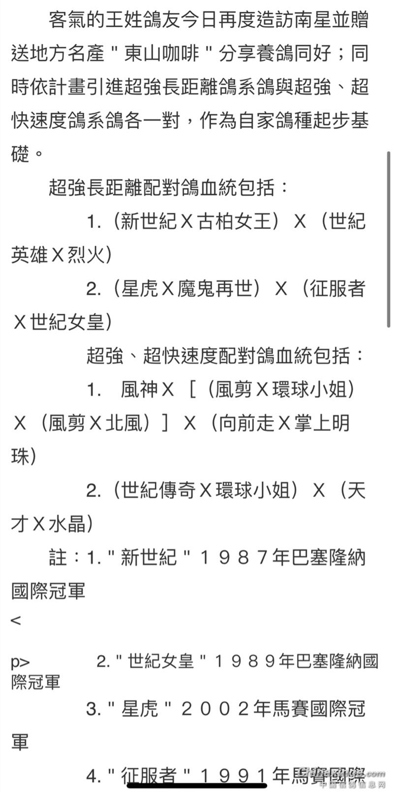 客气的王姓鸽友在造访南星时赠送地方名产“东山咖啡”分享养鸽同好;同时依计划引进超强长距离鸽系鸽与超强、超快速度鸽系鸽各一对,作为自家鸽种起步基础。