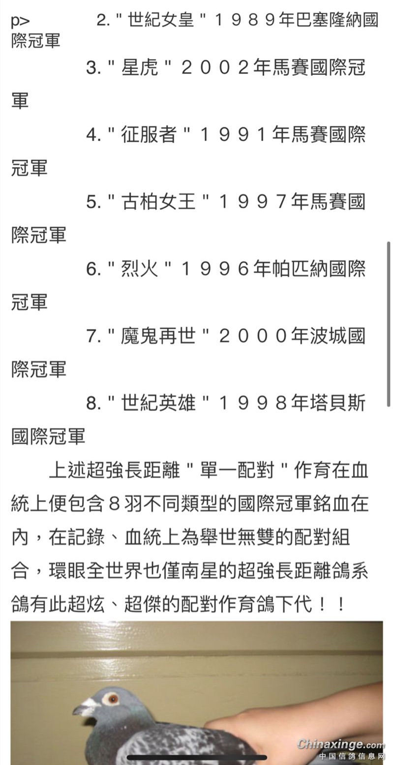 上述超强长距离“单一配对”作育在血统上便包含8羽不同类型的国际冠军铭血在内,在记录、血统上为举世无双的配对组合,全世界也仅南星的超强长距离鸽系鸽有此超炫、超杰的配对作育下代!