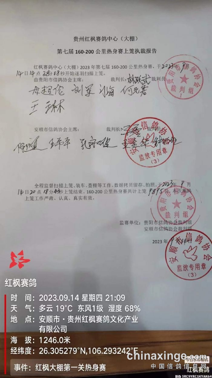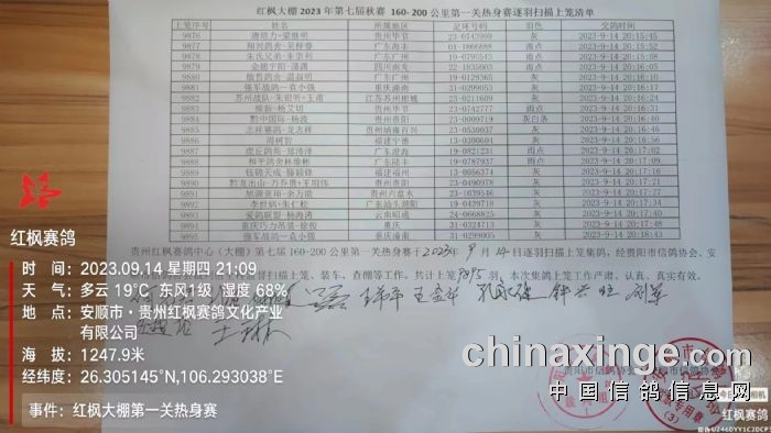 贵州红枫小棚:第一关热身赛,司放地广西南丹,参考空距182公里,上笼14406羽,于早上7:56放飞。今年为第12届比赛,收费1500元,收鸽22132羽,以断层优势荣登贵州地区公棚收鸽榜第一名。第一关热身赛均取奖前100名,冠亚季军分别奖励1万元、8千元、5千元,尾奖0.15万元。