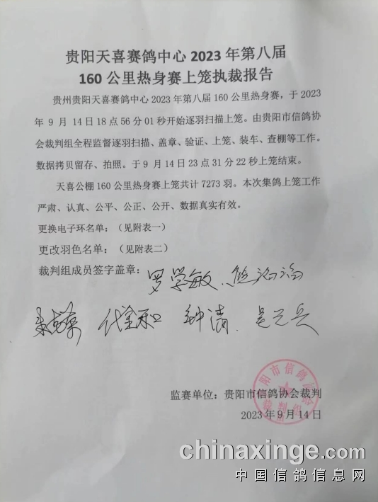 贵阳天喜赛鸽中心:160公里热身赛,司放地广西河池南丹,参考空距:186公里,上笼7273羽,于7:50开笼。今年是贵州天喜的第八届秋赛,参赛费1400元。第一关热身赛取奖150名,其中冠亚季军分别奖励2万、1万、8千,尾奖各1000元。