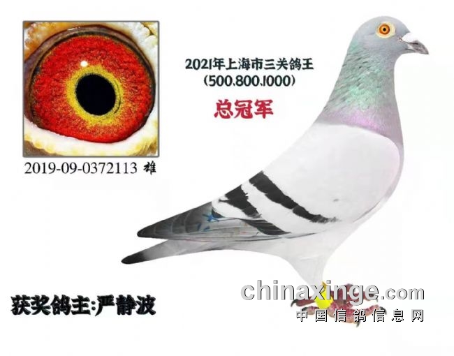 2021年,严静波的19-0372113赛鸽荣获三关鸽王总冠军,第一关16944羽90名、第二关国家赛9333羽168名、第三关千公里5478羽19名。