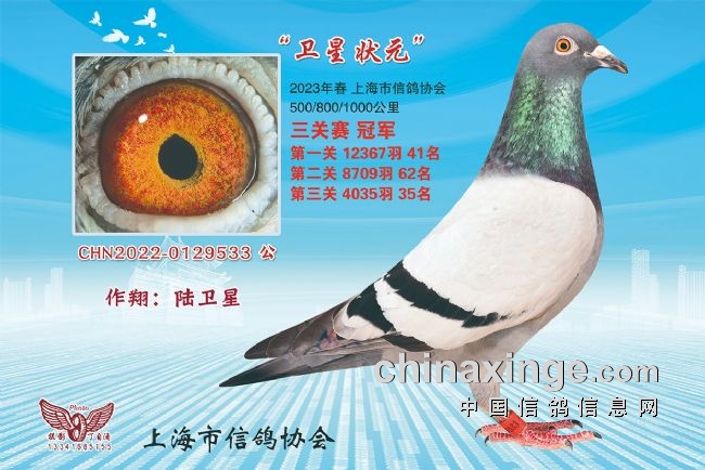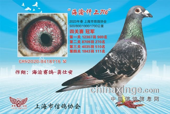 2023年,鸽界老将陆卫星的22-0129533赛鸽荣获三关鸽王总冠军,第一关12367羽41名、第二关8709羽62名、第三关4035羽35名。赛鸽名家海渝实业龚仕安的20-0418716赛鸽荣获四关鸽王总冠军,第一关12367羽969名、第二关8709羽270名、第三关4035羽510名、第四关1843羽111名。