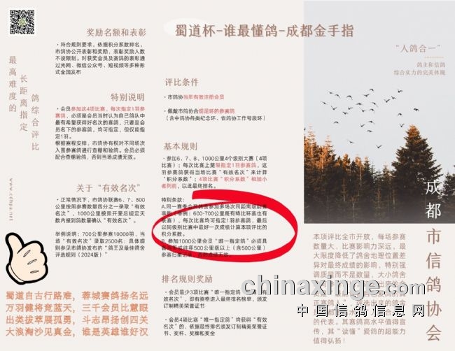 “蜀道杯-谁最懂鸽-联赛金手指”评比2024年系首届大奖,全国鸽友瞩目!欢迎我市广大会员积极报名参赛!如遇特殊情况无法完成全部赛程,市鸽协有权根据实际情况调整本次评比规程细则,以最后评比出今年春季我市最高水准“人鸽合一”金牌会员!